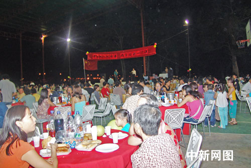 10月1日晚7时,亚加里俄中华商会也在商会灯光球场举行盛大的欢度国庆中秋佳节晚会,当地华人华侨、传媒友好人士等700多人参加。会场内高挂彩色气球,四周摆满了鲜花和万年青等盒景。主席台上悬挂的“中秋明月照中华两岸同胞一家亲”横幅十分醒目。