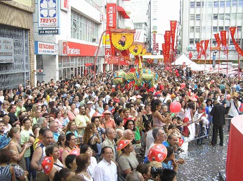 当天中午成千上万巴西民众聚集在自由区广场,会场内外及附近街道挂满中国的红灯笼、中国锦旗幡帐,路边摆满中国的美食及工艺品售货摊亭,到处洋溢着中国春节的热烈喜庆气氛。