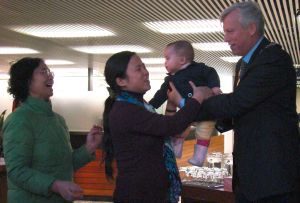 原拟与女儿在元旦日同到市议会大楼内欣赏元旦音乐会的天津女移民国红,与14岁女儿海宁,成为09年首名与市长苗大伟握手祝贺新年的华裔市民。08年对她来说意义重大,因为女儿海宁到多伦多与她团聚,故国红的新年愿望也离不开女儿海宁。