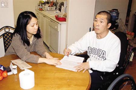 不过,李福胜现在已经可以拿起笔来,签上自己的英文姓名。16日晚上,在张慧容及中侨互助会人员协助下,李福胜在加拿大伤残津贴的表格上,一笔一划地签下了自己的姓名。张慧容说,两个月前,李福胜没有办法写字,现在偶尔可以写字与家人沟通,但问题还是很大,因为他有时不记得中文如何写,有时他写的,家人又不明白。