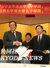 中新网10月26日电 旨在推广汉语增进文化交流的教育文化设施“孔子学院”将在位于日本大分县别府市的立命馆亚洲太平洋大学(APU)成立。据日本“共同社”报道,25日,该大学举行了协议签署仪式。