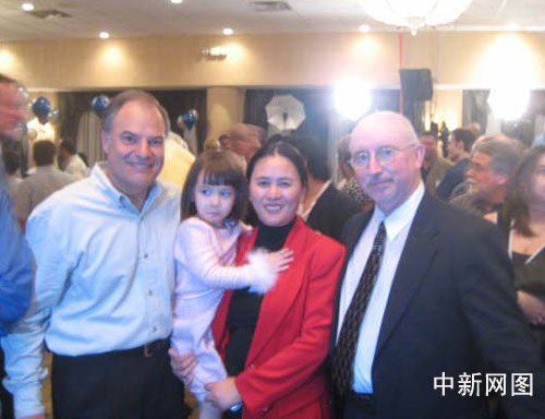 蓝普森(左)在其亚裔助选委员会主席罗玲女士(中)夫妇的全力推动和组织下,成为休斯顿华人社区的好朋友。(美国《美中信使报》供图)