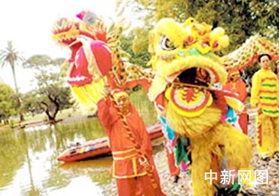 但最为出彩的则是旅阿华侨广东同乡会的舞龙舞狮节目,当广场上华灯初上的时候,十位穿着民族服装的华侨,在激越的鼓点声中腾龙跃狮绕场一周,顿时把节庆的气氛推向高潮。布市市长特雷芒也深受感染,上台即兴祝词,向中国华侨以及所有在阿根廷首都生活的移民们致以节日的问候和祝福。阿中文化交流协会也派出20人的表演队伍,在节日上表演了中国的特色的民族歌舞。而阿根廷福建同乡会副会长郑文彬的“点心摊”前则挤满了闻香而来的食客。
