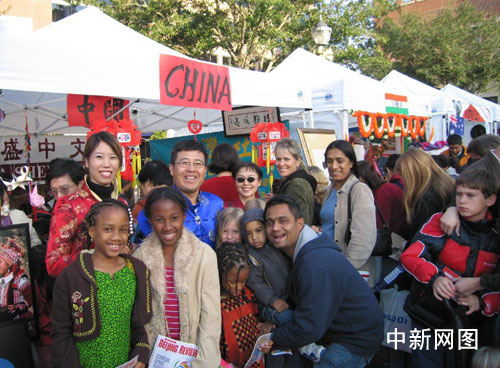 高大的圣诞树耸立在广场中央。广场两侧摆放了十几个摊位,包括美、中、越、印、日、德、墨西哥、以色列、澳大利亚、中东、南美等国家,各族裔一起展示了本民族的文化。