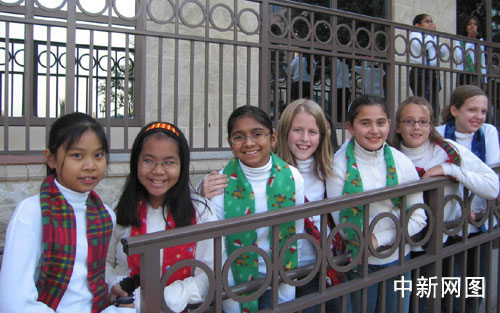 中、越、印、美的学生(从左至右)等候上场演出。(美国《华夏时报》图)