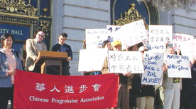 据美国《明报》报道,出席当天示威活动的皆是高科技产品制造商魔声公司的前华裔雇员,他们于10月份遭公司解雇,理由是公司将制造工序外判,故裁减多达120名员工,当中几乎全部是华裔。华人进步会得悉事件后,即与该批工人联系提供援助。