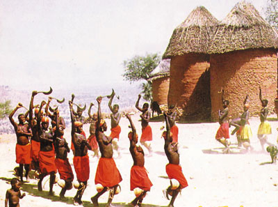 下午四点多钟仪式才结束,我准备赶回厂,但卡娅斯不让走,她比划道:要我把姐姐送到男方家里才能走。我没办法只好随着他们一起到男方所在的村落,其实并不远。这儿又是一片欢乐的人群,人们同样用惊奇的目光看着我,把我奉为最尊贵的客人。在酋长的带领下我们来到新房,这栋新房是用红泥糊甘蔗杆盖的。门前一前一后燃着两堆炭火,门口还有一道很粗的红线。我不知道这都是干什么用,卡娅斯费了好大的劲比划了半天,又是卢语,又是汉语再加上法语我才明白:新郎必须趴在第一堆火上,由新娘家的人牵着她的姐姐从新郎的背上走过去,这是表示丈夫对妻子的尊重,也是表示将来的生活无论多么艰辛困苦都不畏惧,什至可以付出自己的生命。这是一种原始的爱情表达方式。然后再抱着新娘跨过第二堆火,把新娘交到新郎手中。这是表示妻子对丈夫忠贞不渝的爱情的诺言,当她被亲人送进丈夫的家门后,将把一切邪恶拒之门外,然后把她交给最信任的人。