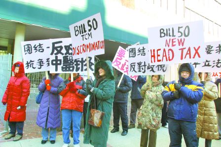 当天上午的气温低至摄氏零下7度,连同风寒效应,令人感觉置身于摄氏零下13度的冰天雪地。约有120名省内中医针灸行业的从业人员参加了上述示威活动,他们无惧寒风凛冽,高举“捍卫安省中医职业权,反对50号法案”、“团结起来、反对歧视”、“一个专业、一个标准”、“50号法案危害公众”等标语牌,并高呼要求“安省卫生厅长斯密瑟曼下台”以及“将安省自由党政府赶出省议会”等口号。