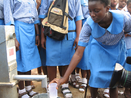 校长扎多克·阿迪加带着一帮学生已经在手压泵井旁等候采访了。接了满满一杯清澈的井水,阿迪加抬起头,一口气喝了下去。