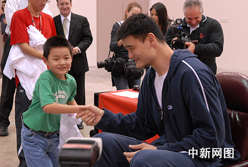 当地时间2月12日下午,姚明来到了休斯顿中华文化服务中心,与这里的几十名少年儿童一道,提前欢庆春节。姚明在和儿童们进行了互动问答之后,又为儿童们签名,也给每个儿童发了一个小红包,里面放着一美元。(所有图片均为美国《美中信使报〉/《明桥体育〉提供;记者 何伟文 摄))
