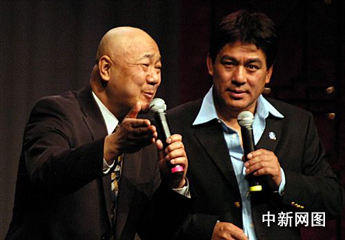 剃光头、穿西服的笑星张大礼临时拉朱时茂配戏说相声,滑稽搞笑,轻松逗乐。
