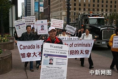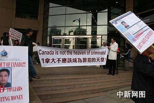 在加移民暨难民局温哥华办公大楼前,游行者打出了“不要浪费纳税人金钱,马上遣返高山!”、“加快和中国签订引渡协议!”、“完善移民法,让国际犯罪分子远离加拿大!”等标语横幅。中新社记者吕振亚摄