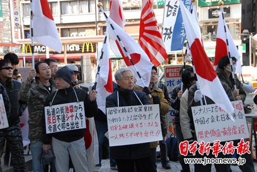 中新网1月10日电 10日,《日本新华侨报》记者在现场看到日本右翼团体在东京池袋中国人物产店——“阳光城”物产店前举行抗议活动的计划,在警方的阻止下没有得逞。
