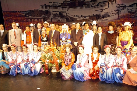 演出结束后,中国大使馆向西藏自治区歌舞团献了花篮,张春祥大使及各位领导人上台同演员亲切握手,祝贺他们演出成功,并同全体演员合影留念。