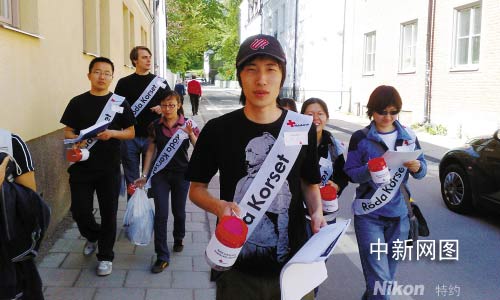 在瑞典的莞籍留学生们走上街头为灾区募捐。作者 王曜锋