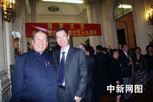 是晚的中国驻法使馆内张灯结彩,一派喜气;走廊里布置的北京国家体育场——鸟巢掩映在璀璨的礼花中,分外夺目;旅法华人社团向祖(籍)国祝贺生日的花篮从使馆大门口排到了二楼。身着中式礼服的中国驻法大使与侨胞们同贺祖(籍)国59华诞。