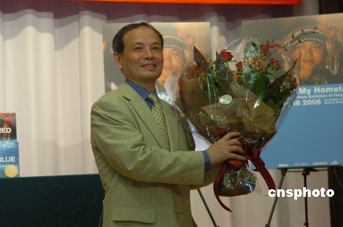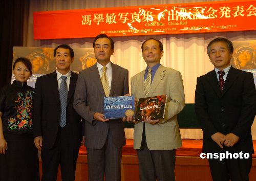 旅日著名摄影家冯学敏的最新摄影作品集《中国蓝、中国红》七月二十五日下午在中国驻日使馆举行发布会。中国驻日大使王毅、文化参赞赵宝智等出席了发布会,日本摄影、出版界及媒体人士近五十人与会。王毅大使等向冯学敏表示祝贺。中新社发 王健 摄