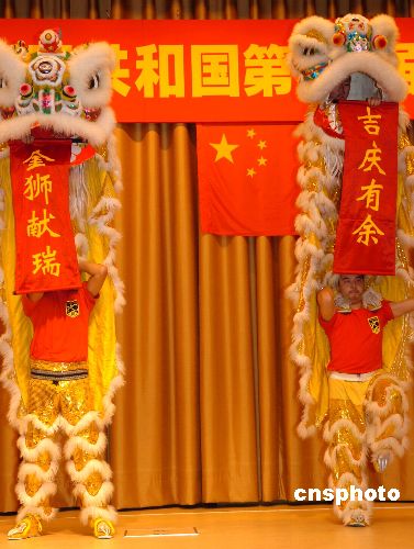 日本著名华埠横滨的华侨九月二十九日举行盛大国庆庆祝会,庆祝祖国五十七周年华诞。图为当地侨胞在庆祝会上舞狮助兴。中新社发 王健 摄