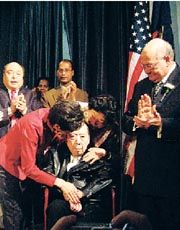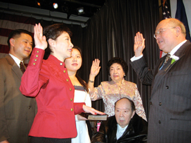 在全场热烈的掌声中,杨爱伦在美国联邦众议员艾克曼的带领下宣誓就职,并和她的父母、女儿等家人深情拥抱。(来源:美国《侨报》 记者余小平)