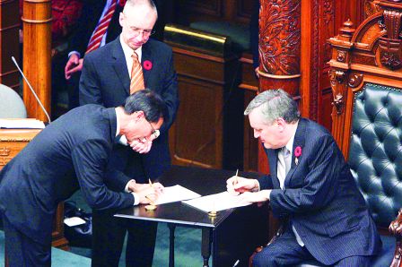 中新网11月1日电 据加拿大《明报》报道,竞选连任成功的加拿大安省省长麦坚迪10月30日率领新内阁宣誓就任。华裔省议员陈国治再上层楼,被麦坚迪委以重任,出任安省公民及移民厅厅长,成为安省内阁的一名重要成员。陈国治在宣誓就任的仪式结束后向中文媒体表示,感谢省长给他这个机会,可以为安省的新移民、新公民服务。
