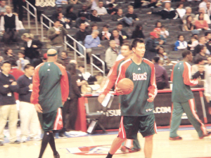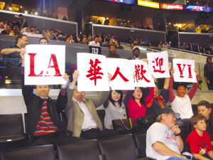 这是易建联第一次重返洛杉矶比赛。众多华裔球迷到场为易建联呐喊助威,有的还打出“LA 华人欢迎易”的横幅。