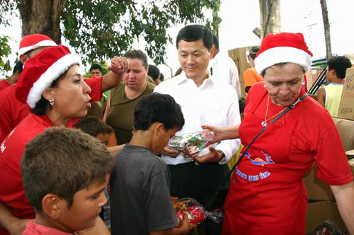 12月14日上午,中国驻圣保罗总领事孙荣茂夫妇及巴西华人协会会长吴耀宙,特地飞往南马托格罗索州的首府坎波格兰特(CAMPO GRANDE)市,参加了由市长夫人安东尼耶塔主持的圣诞礼物赠送仪式。
