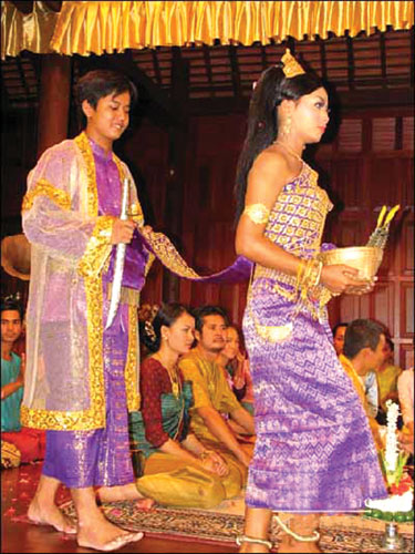 婚礼上,新娘须为进门的新郎洗脚,以示今后就是一家人,而新郎必须站着接受洗足礼。婚宴之后还有舞会,它是整个婚礼的高潮。男女宾客围成圆圈,随着乐曲跳起高棉舞蹈。在农村,舞会往往持续至深夜。