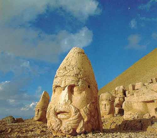 人像山是我自己编的名字,它的音译应该为内姆鲁特山。有些台湾旅游书上把它叫作人头山,听着很是恐怖。雕像伫立在海拔2150米高的内姆鲁特山顶,这里其实是科玛吉内的国王安提俄克斯一世的陵墓。在这个英俊的国王的陵墓前面,列着他喜爱的神明雕像,他自己的雕像也挤身其中。我想,他是希望自己死后能入“仙班”,或者说,他本就是神……