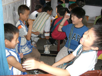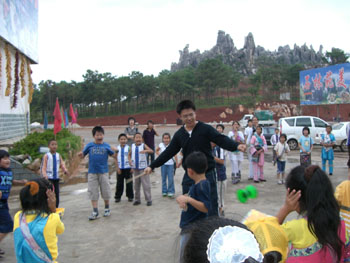 在捐赠仪式上,云南省侨办副主任王冰女士致欢迎词,随后石林县统战部杨副部长、县教育局华副局长、石林镇中心小学张校长以及夏令营领队、日本同源中文学校理事长杨林分别发表了讲话。出发前31名小营员听说云南还有很多生活贫困的孩子,他们特意在日本准备了礼物、捐款以及衣服、被褥,千里迢迢带着这片爱心,郑重地把自己的礼品和捐款送到结伴的小朋友手中。石林镇中心小学的31名彝族小朋友们也把他们以及他们的妈妈绣制的民族包送给了我们的营员。随后,他们手拉着手,在教室里,在校园中,谈笑风生。淳朴开朗的彝族小朋友们向我们的小营员介绍他们的学校,询问小营员们的学习情况;有的小营员则教彝族小朋友用日语划拳,赢了的一方笑得前仰后合(见图片3);彝族小朋友现场表演空手翻,我们的“才子”李昊练习抖空竹,都赢来了惊叹和掌声(见图片4)。值得欣慰的是,此次参加夏令营的小营员们,大的16、7岁,小的不过6岁,个个会说汉语。学生们还主动交换了通讯地址,表示今后也要经常通信交流。