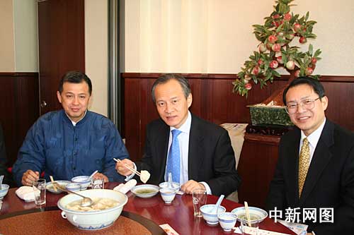 崔天凯大使接着来到中华街上的老字号东荣酒家,和神户华侨总会会长鲍悦初、株式会社东荣商行代表王锐辉等当地华侨代表一边吃饺子一边交谈,了解饺子事件的各种负面影响。