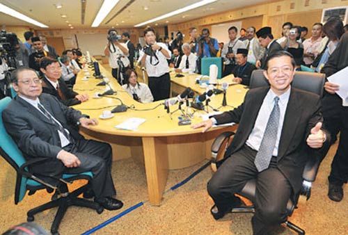 林冠英以槟州首长身份,第一次在首长办公楼召开记者会。(马来西亚《光华日报》图)