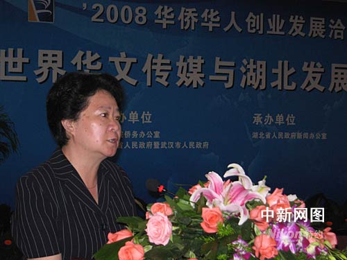 湖北省副省长张岱梨出席世界华文传媒与湖北发展论坛并致辞。