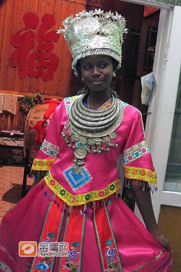 当晚,在热情的中国家长带领下,汉语桥选手“黑珍珠”闯三关:对山歌、喝米酒、击鼓后,顺利入住苗家,当穿上苗族服装,“黑珍珠”兴奋地在镜子面前转了几圈,表达喜悦的心情。(李湘)