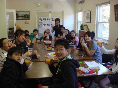 接着,他们纷纷到讲台上演讲“我所知道的中秋节”,“我眼中的中秋节”,讲了嫦娥奔月、吴刚伐桂及小玉兔的故事;还有的同学讲述了自己家是怎样过中秋节的。杨菽慧同学画了一幅嫦娥奔月图送给了张老师。龚亭宇同学还不到七岁,在此之前,他并不知道嫦娥奔月的故事。当听完其他同学的演讲后,他也要讲,可是一紧张忘了漂亮嫦娥的名字,急得直要哭。张老师问他:“这个漂亮的阿姨是张老师吗?”他破涕为笑,说:“不是”。同学们一起告诉他是“嫦娥”。他接着把这个故事完整地讲给大家,还说回家后告诉爸爸妈妈。身穿中国传统旗袍、打扮成小公主样子的陈李莉同学只有八岁,她做了“我眼中的中秋节”的作业,并在课堂上有声有色地演讲“嫦娥奔月”的故事。
