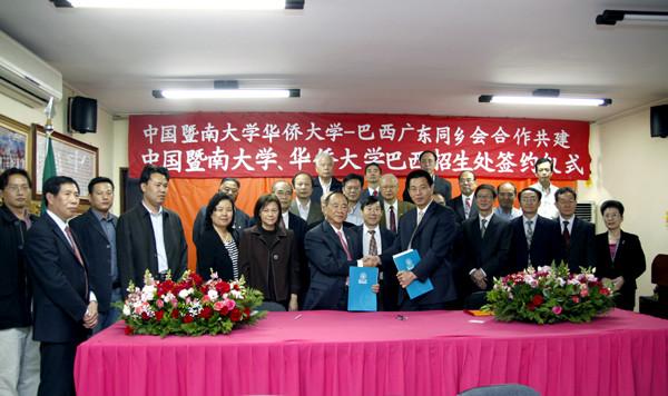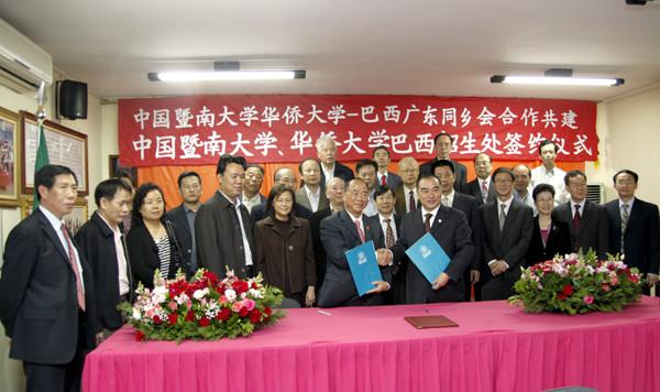 中新网10月25日电 据巴西南美侨报/巴西侨网消息,中国暨南大学、华侨大学与巴西广东同乡总会合作建立招生处签字仪式于10月23日在巴西圣保罗举行,中国驻圣保罗副总领事边春刚、中国国侨办文化司院校处处长别林业出席了仪式。