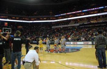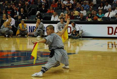中场休息期间在全场观众经久不息地助威声下,费佛尔大学孔子学院邀请的4位功夫大师由爱美丽·罗德女士率领步入球场中央,功夫大师们恭谨地向全场观众行佛礼。这时赛场主持人以NBA式的浑厚嗓音向现场观众发布: “让我们热烈欢迎今晚的特别嘉宾,费佛尔大学孔子学院少林功夫大师,他们给我们带来了拥有1700年历史的中国地道的少林功夫。”