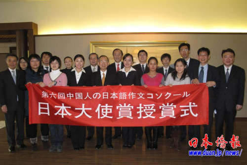 中新网12月18日电 第六届中国人日语作文大赛颁奖典礼12月18日下午在北京日本大使官邸举行。日本驻华大使丹羽宇一郎为获得最优秀成绩的西安交通大学日语系三年级学生关欣颁发了“日本大使奖”,日本财团理事长尾形武寿向获奖者赠送了纪念品。