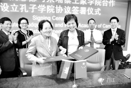 经过近两年的精心筹备,设立王家学院孔子学院的条件已经成熟,中柬合作双方加紧履行申办孔子学院的相关手续。8月12日,应九江学院的邀请并受宋安副总理的委托,柬埔寨王家学院院长克洛堤达博士率王家学院代表团抵达北京,访问国家汉办暨孔子学院总部。孔子学院总部总干事许琳女士会见了克洛堤达博士,双方分别代表孔子学院总部和柬埔寨王家学院,签署了《中国孔子学院总部与柬埔寨王家学院关于合作设立王家学院孔子学院的协议》。至此,柬埔寨第一家孔子学院正式宣告诞生。