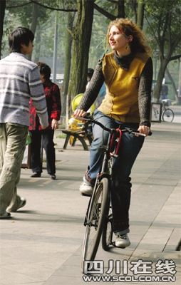 刚来成都,她发现了一件事:“这里没有自行车没法活”。上下班高峰时间打不到车,挤公共汽车又难受。奥丽娅找朋友借了一辆自行车学习,只花了一天,她就能够保持平衡行进。此后,川大校园里又多了一名骑着自行车的金发学子。