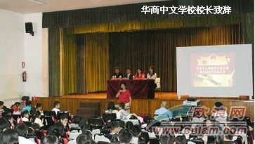 华商中文学校校长黄英首先致辞,她说,祖国60周年大庆,国内人民与海外侨胞共欢颜,又逢学校开学典礼,双喜临门。在谈到华商中文学校学生成绩的时候,黄英很是欣慰和自豪,她说学校学生参加的一系列的竞赛,都取得了令人满意的成绩,其中三位学生在HSK汉语考试中脱颖而出,表现相当抢眼,而在国务院侨办组织的海外华人学子书画展上,学校共有20名学生获奖,从一定程度上调动了学生的热情和积极性。黄英还特别提到了学生的个人荣誉的问题,她说学生的荣誉既属于个人,更属于整个海外华人学子,为中国人争光,应该感到无比的骄傲和自豪。