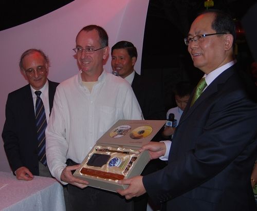 在庆祝晚会上,邱大使和热拉尔多校长共同为《把目光投向中国》的摄影图片展剪彩。