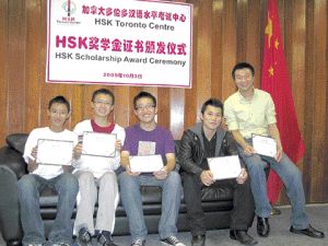 郭凌清、李赋涵、张庭、黄帝钧、张龙江五位同学,都在去年参加由加拿大多伦多汉语水平考试中心主办的中国国家汉语水平考试,并取得优异成绩。4日他们在亲友和家长的陪同下,领取国家汉办孔子学院奖学金证书,并畅谈暑期前往中国学习汉语的美妙经历。