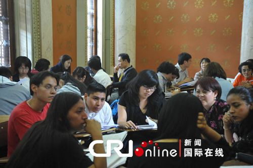 在本次培训班上,有一个人一直吸引着记者的目光,她的双鬓已经斑白,一缕麻花辫上系着一个小小的中国结。她名叫库埃亚尔,是这期培训班里年龄最大的学员。1985年,库埃亚尔曾来到中国研修汉语语言学,两年后她回到墨西哥,开始从事汉语教学,一转眼便是二十余载。对于学习汉语,库埃亚尔有自己独到的体会。她说:“我觉得如果你开始学习汉语,你不能停,因为没有办法,你停不了,停了不行,因为汉语是比较难、也比较丰富的一个语言。所以如果你停止学习,你的汉语水平(就会)越来越差。学习汉语(让)你有一个非常大的机会了解到世界很大。所以我觉得真的学习汉语越学越喜欢。”
