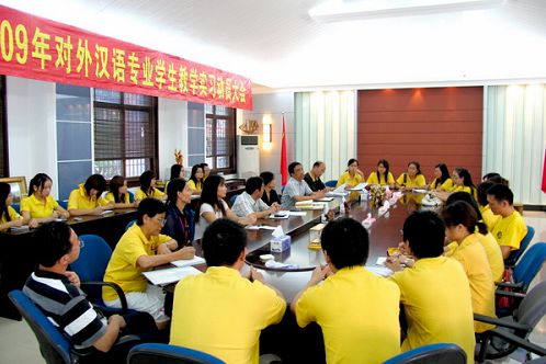 中新网10月10日电 据华侨大学华文学院网站消息,10月9日下午,华侨大学2009年对外汉语专业学生赴泰国参加“中华文化大乐园”教学实习动员会举行。华大华文学院副院长陈旋波、副书记张灯、副院长李晓洁以及5位部门领导和24名对外汉语专业学生参加大会。