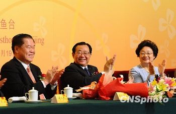 10月19日上午,全国政协副主席王刚、国务院侨务办公室主任李海峰(右)出席印度尼西亚华侨、金光集团董事长黄志源(左)向中国华文教育基金会捐资一亿元人民币仪式。 中新社发 侯宇 摄