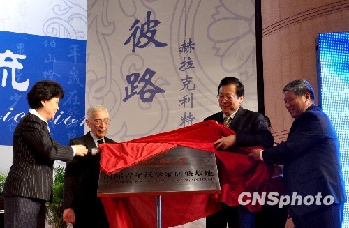 10月30日早上9点30分,“国际青年汉学家研修基地”揭牌仪式在第二届世界汉学大会开幕式上举行。由教育部副部长郝平、中国人民大学校长纪宝成、国家汉办主任许琳及英国剑桥大学教授鲁惟一共同揭牌。 中新社发 安微 摄