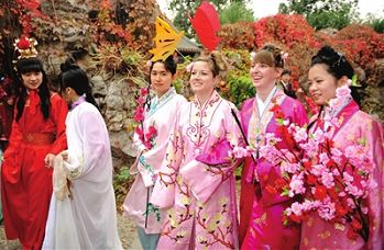 身穿古装的中外学生们用不同的形式演绎着祭花神、黛玉葬花、宝钗扑蝶、宝黛读西厢等经典片段。(周民、李秋萌 文/图)