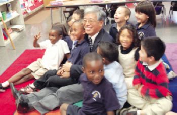 近30名年龄不满7岁、来自不同族裔的小朋友异口同声,以一口纯正普通话“您好,欢迎您”问候来宾,张云啧啧称赞,不禁抱起小朋友,连说:“谢谢,谢谢!”
