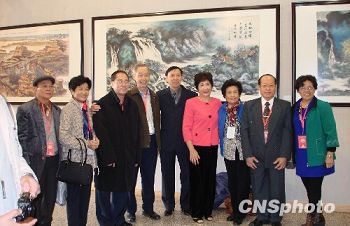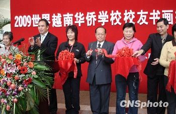 11月17日,2009世界越南侨校校友书画摄影艺术展在广西南宁开展。参展的近50幅作品由来自世界各地的越南侨校校友画家、书法家创作,包括加拿大温哥华艺术家韦长华、加拿大著名摄影家焦根基等。艺术展分为油画、水墨、水彩、书法等种类,内容涉及山水花鸟、人物、历史、古诗词等。图为广西壮族自治区侨联副主席刘汉祥、加拿大越北华人联合总会主席谢卓裕等嘉宾为艺术展剪彩。 中新社发 黄艳梅 摄