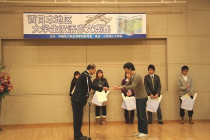 12月20日,中国驻大阪总领事馆教育室在立命馆大学举行了西日本地区大学生中文作文比赛颁奖仪式。教育室主任刘占山为获得一等奖的神户市立外国语大学的渡部恒介同学颁发了荣誉证书和三万元的图书卡奖品。立命馆孔子学院院长周玮生为获得二等奖的龙谷大学的北村篮子和关西外国语大学的增濑有佑同学颁发了荣誉证书和一万元的图书卡。获得三等奖的同学有龙谷大学的韩国留学生权纯睦、神户市外国语大学的油谷优太、京都外国语大学相川瑞穗和神户松荫女子大学的古川翠。